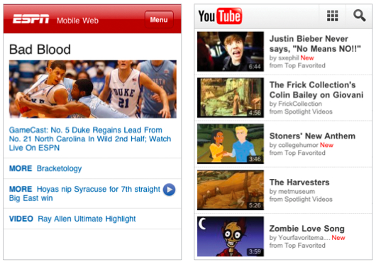 Youtube ESPN的移动网页就是这样做的。先是一个简单的抬头告诉你身处哪里,将导航选项降级为一个单独的按钮。其余的位置放置可随时查看的最新信息(ESPN)和最热的供消遣的视频。 ESPN Youtube移动网页体验将重点放在内容信息上,而不是导航上。 定位和探索 但是,请稍等一下,如果内容总是优于导航。 关于返回键 许多iphone的原生应用在导航上都有个永久的返回按钮。由于苹果的移动设备没有硬件上的返回按键,所以很多app都在顶部标题栏设置了返回按钮。