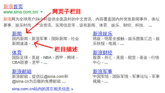 全站链接也称整站链接,简单的说就是一个站的所有页面都会出现的链接到站外同一个地方的链接。另外,也有一个是“Google全站链接”,这是谷歌的种搜索结果的显示方法。 先说下全站链接。全站链接一般用于做友情链接以及广告。而作为购买性的外链,这其实可以归到广告一类中去。全站链接给被链接方所提供的权重很高,因为每一个页面的权重都会分给被链接方。特别是大型站,内页的权重也是挺高的。作为被外链方,全站链接绝对是首选中的首选。只不过看附出的代价怎么样而已。 而有优点自然也会有缺点。因为分权重原因,一些本来权重也不太高的小站,做全站链接有可能会把自己的权重分散。其他的链接所分出去的权重变低。如果小站都 挂的是全站链接的话,会出现链接自己打架,权重过于分散的结果。对发链接方的网站权重影响不一定大,但被链接方得到的是这样的链接的话,得到的好处会很 小,甚至不会有任何好处。 再说一下“谷歌全站链接”,英文是“Google sitelinks”,这是谷歌新使用的一种搜索结果的展示方式,比如搜索新浪,会出现下图: