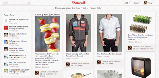 Pinterest于2011年诞生,如今每月独立访问用户数量已突破1100万,平均每位用户每月在网站上逗留98分钟,这一时长在诸多社交平台中仅次于Tumblr和Facebook。Pinterest作为瀑布流布局的鼻祖,必然引导瀑布流设计的方向。 1.吸顶式导航