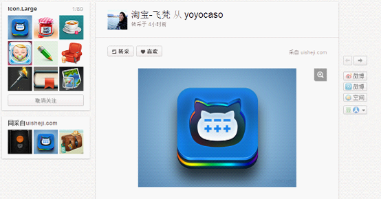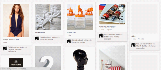 用户在不断滚动鼠标滚轮浏览的过程中,网速并不总是尽如人意的,因此采用占位加载形式(预加载出图片高度的灰度图),不让加载过程中画面过于跳动, 可以让用户视觉体验平缓些,视觉过度流畅,尽量小的干扰用户浏览的行为。 5.Pin it 工具的便捷 Pinterest模式为首的瀑布流网站另一利器便为Pin it 工具。用户在各式网站的浏览中,用Pin it先为自己收藏内容,其次为网站创造内容。而且可以将pinterest作为用户的一个在线图片收藏夹,当用户喜欢的内容在这儿了,流量也就不用担心了。 Huaban 花瓣网是较早的“类Pinterest”网站之一,定位是基于兴趣的社交分享网站,网站为用户提供了一个简单地采集工具,帮助用户将自己喜欢图片重新组织和收藏。花瓣在设计与体验上与Pinterest十分相似,但是也有一些自己的贴心细节设计。 1.Icon+Title的配合,让导航更简洁。