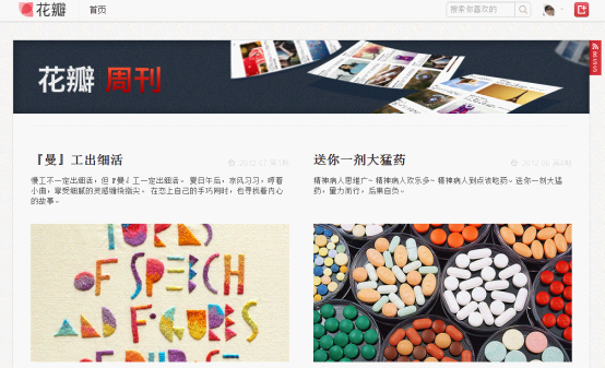 如何给用户以最新最热的内容呢,花瓣周刊是方式之一。通过一个简单的页面聚合最流行的内容,也是帮用户发掘兴趣的手段之一。 3.右翻页大一些
