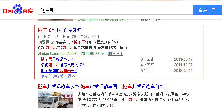需求:搜索led广告车,出现百度贴吧,该关键词存在讨论需求,很多客户很希望与其他客户交流讨论相关的信息。比如上图中的“led广告车”是用来宣传广告,如何做出广告效果,和怎么租借,租借费用等等这样具有很强的讨论需求,大家都希望跟大家分享心得。除此之外,游戏类、养殖类、手工类行业都具有很强的讨论需求。这些行业,百度贴吧都很有可能参与排名。 解决方案: (1)既然有讨论需求,那么网站最好留一栏目搭建讨论模块。 (2)论坛的活跃度要高,只有当我们论坛的用户活跃度超过了百度贴吧,才有机会超越它。 (3) 很多百度贴吧是没有管理员或管理员不负责,会充斥很多广告或者无关信息,我们的论坛只要勤加管理,营造出很好的氛围,就可以轻易的超越百度贴吧的用户体验。 3.搜索车型随车吊,结果页出现“百度知道”,那应该如何满足呢?