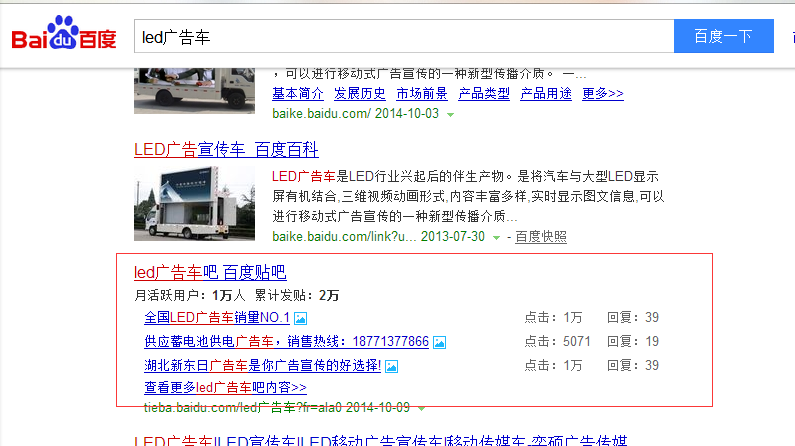 需求:搜索关于专汽车型,大部分车型出现图片,说明用户一般在看车型的时候,第一时间需要了解车型图片,所以百度图片出现首页很正常。 解决方案: (1)既然有图片需求,网站最好是为用户提供高清大图、并且提供的图片要足够的多和全。 (2)用户在寻找图片的时候,会需要筛选功能,我们网站的图片筛选功能应该根据相对应的行业进行设计。 (3) 最好提供图片免费下载功能,或者是套图打包下载的功能。 2.搜索车型led广告车,结果页出现“百度贴吧”,那应该如何满足呢?