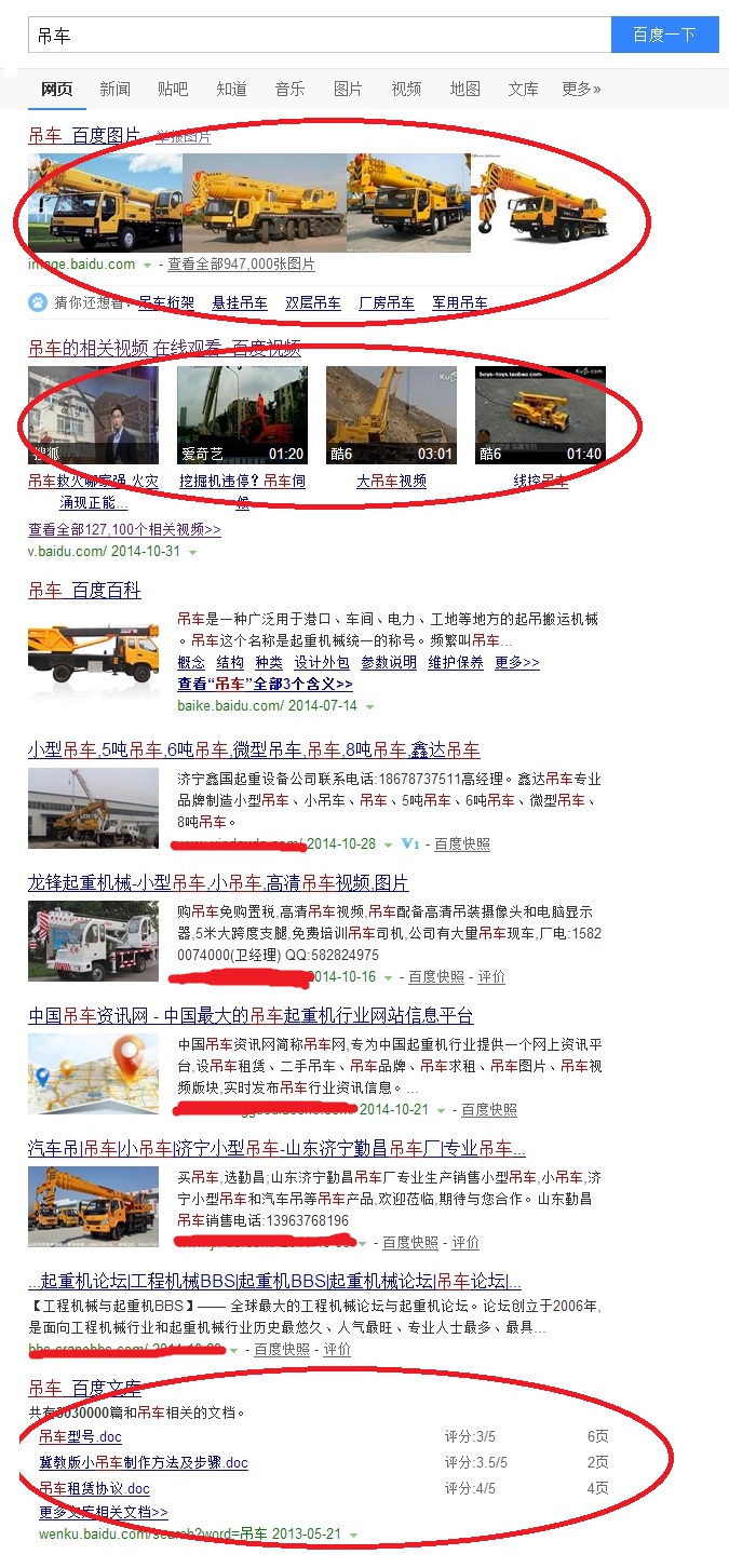 需求: 出现百度文库,说明用户有资料需求。 通过上图可以看出搜索“LED宣传车”这个关键词的用户大部分都在找运营和租赁的方式的资料,了解LED宣传车如何盈利等方式。 一般车型很少出现文库资料,但相对于led宣传车的话,是一个新起车型和新的宣传行业的成本核算等等。 解决方案: √ 做之前可以考虑下参考下别人网站资料,用户关心的问题,比如租赁的方式成本,如何制作宣传视频教程文档等等。 √ 既然用户有资料需求,那么我们网站提供的信息就应该权威、完整、接底气。 √ 最后在新型行业中,我们在摸索如何前行,有很多资料和不了解会存在,所以在跟客户沟通的时候,把这些问题记录,然后解决,做成资料发表。 4.出现多个百度产品怎么办? 如果某个关键词,出现多个百度产品参与竞争,那么说明这个关键词具有多重需求。 例如我们刚才讲的“吊车”,该关键词又有百度视频,又有百度图片,又有百度文库……