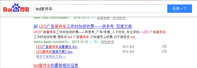 需求: 出现百度地图,说明用户有寻找联系方式和地址的需求。 一般搜索这个词的人群,已经对程力这个品牌有所了解,也有可能是找客服的,因为其中的原因,大家懂的。所以请大家卖车的时候留好自己联系,要不然人家找别人买了。 一般来说,本地服务类行业比较容易出现百度地图。 因此,如果你所做的关键词,发现在百度搜索出现了百度地图,那么你就需要注意下面几点了。 解决方案: √ 网站的顶部,要清晰的显示出自己公司的地址和联系方式。 √ 源代码中,描述元素里面要包含联系方式。 √ 在网站中展示自己的公司地址,有代码基础的,可以调用百度地图官网的API来显示。 3.搜索车型:led宣传车,结果页出现“百度文库”,那应该如何去完善网站呢?