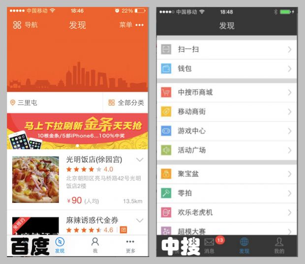 同样是“发现”的移动搜索引擎客户端结果(左侧是百度,右侧是中搜),两家公司就明显不同了,一个是基于lbs定位的店家推荐,一个是更多的应用。我想,吃的确很重要,但也许不这不是我最想要的,因为我不是吃货啊。能有更多好玩的让我选选吗?能让我和我的朋友们聊聊天吗? (责任编辑:admin) |