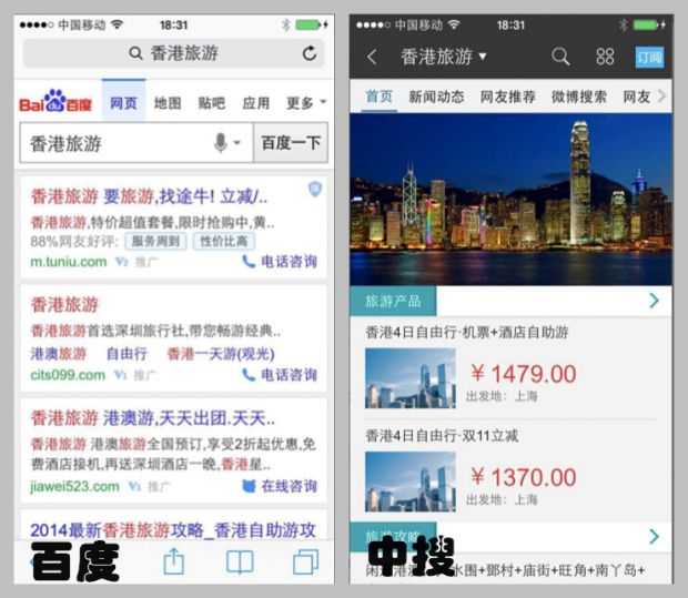 同样是“香港旅游”的移动搜索引擎客户端结果(左侧是百度,右侧是中搜),差距咋这么大呢?这就是改与不改的不同。 当然,目前百度和中搜的移动搜索都分为客户端版本和浏览器版本。 更多话就不用说了,我建议,我们还是拥抱移动搜索的这种变化吧,不要想着人是老的好,在移动时代,“搜索还是新的好”,因为不用你搜二次,省流节时,还整洁大方没广告。 再来唠唠给产品做“加法”问题 还是以中搜和百度作比较吧,很多读者说,你能不能不要把没可比性的公司放一起啊,但我想说,既然有这个挑战垄断公司的雄心,可见人家还是有那个金刚钻的。再说了,现在搜索里也没几家,就选这个曾经和百度站在一起的中搜吧。 中搜在业界是以做“加法”著名的,虽然在今天这个流行给产品做减法的时代“格格不入”,但他还是愿意反而行其道,把更多的创新功能加载在产品上,尽可能的给用户更多的便捷应用和选择。 当然海量的功能是“极致个性化”的基础,中搜走的路子就是“让用户从海量功能和应用中提取自己的个性化”。 所以中搜的移动搜索搜悦是一个极致个性化的“个人”搜索引擎,他们把这个产品命名为搜悦,定位是“个人门户”。 反观百度的移动搜索产品——百度搜索,还是沿用老大风格,强势广告、列表式呈现,其他的东西基本没有了。