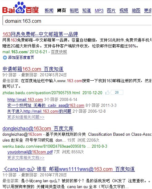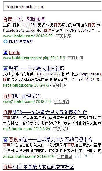 依次是:“百度一下,你就知道”——baidu——贴吧——推广——MP3——知道——空间——….. 分析:百度一下,你就知道第一位无需质疑。中央电视台广告也是打的这个不想第一都不行,权重杠杠滴。Baidu第二更没话说。贴吧比推广MP3知道火爆肯定的。至于文库、百科。文库排名百度前面。有心的朋友可以自己去看看。那么依次看过来,的确是按照火爆认可程度这个规律排列。火爆认可程度某一方面也表明了权重值。表明百度对自己产品权重值的高低区分。(PS:以后SEOSER可以根据百度对自己产品权重值高低做相应外链了)别着急,domain下百度不能证明什么。我们在domain下163,检验下是否是按照权重值高低排名。