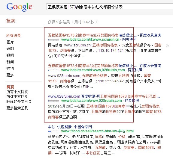 为什么只是看到了国窖1573呢?难道排在第一位的五粮液就不是用户想在google搜索的一部分?google还自作主张了呢?确实感觉这种搜索很wired。不过当江海去掉搜索中的竖杠,google表现得更二。搜索出来的前三个都是同一个垃圾网站,做SEO的人很讨厌的一种站点,专门抓别人的快照,收录人家的SEO、快照信息的网站。对用户一点儿价值没有的网站,排在了前三位。 google真二。中文搜索你确实比不上百度,客观的说一下,还希望百度也不要骄傲。毕竟您的丑闻比google多到哪儿去了,道德上依旧谴责你