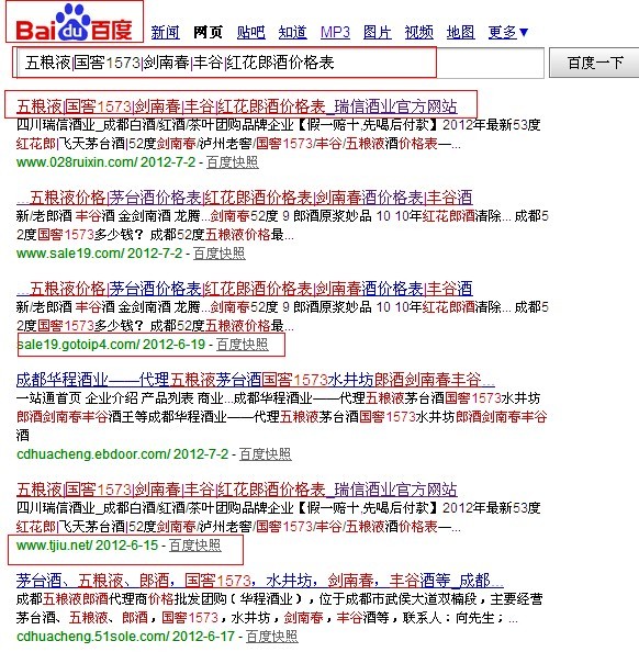 二、百度中文搜索结果 同样的一句话“五粮液|国窖1573|剑南春|丰谷|红花郎酒价格表”,我在百度搜索发现还是很好的,能够精确识别竖杠,不影响搜索结果,同样去掉竖杠“|”,百度的搜索结果依旧是那样精确,李彦宏开创的中文搜索引擎确实很牛掰。