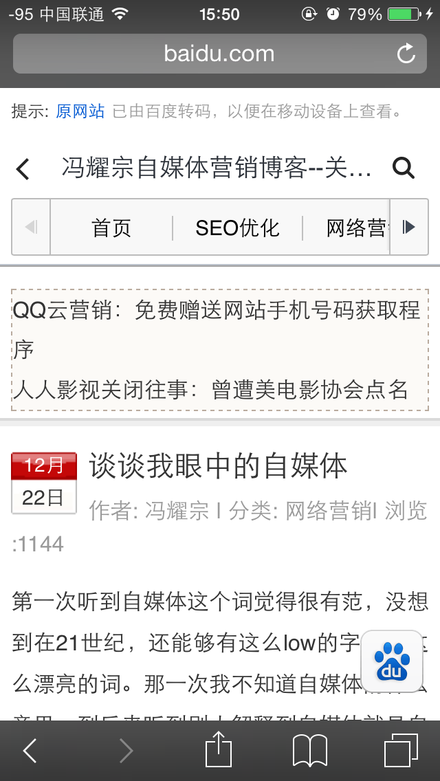今天用手机搜索了我的网站进去以后发现网站由百度转码成手机站,纳闷了我的手机站做的好好的为何转成了百度的手机站?回想一下百度官方的移动网站建设常见问题集锦,我误以为是百度机器无法识别响应式站点,我在搜索了其他网站,发现出现这样的情况还不少,而且他们都有自己的手机站却转成了百度的站!