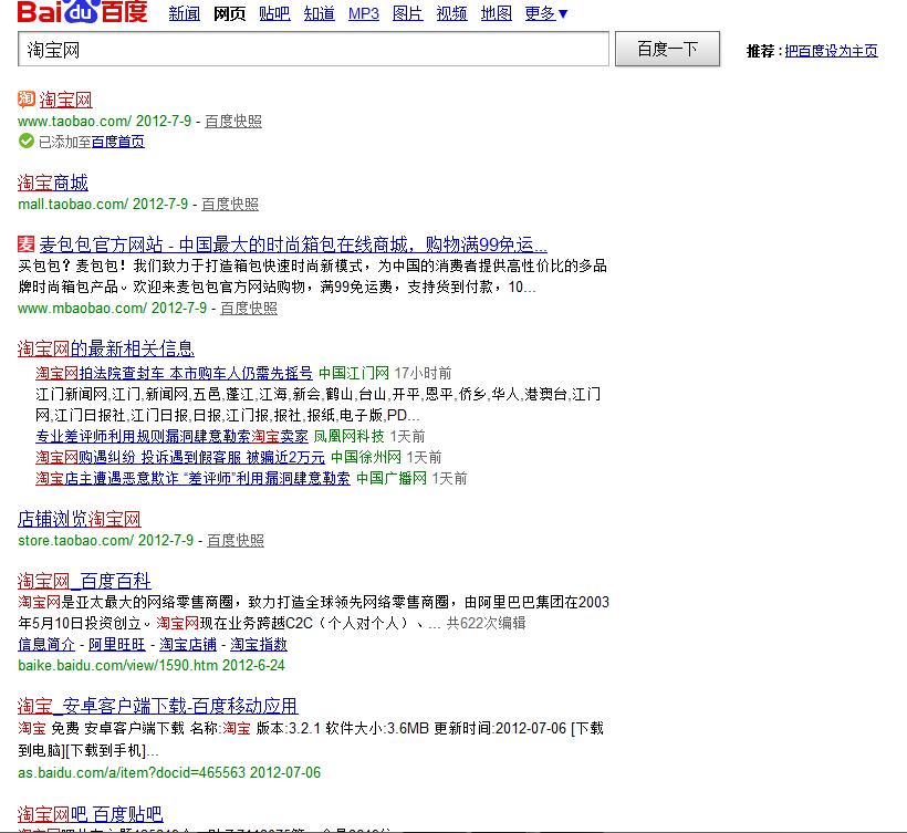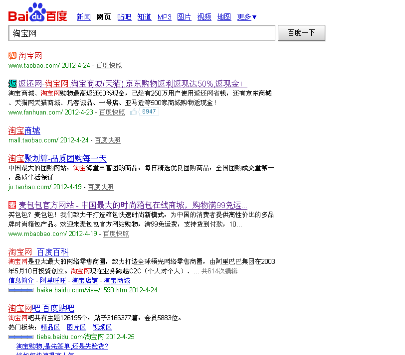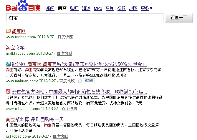 经过六月底百度大更新的洗礼,作为淘宝客之一,有幸在百度大屠杀之后存活下来,但是网站的排名已经大不如前。前一段时间跟昔日一同闯荡的淘宝客站长交流,也有站长网站被k,日子都不好过。因此,这次教训对我来说不止庆幸,应该对淘宝客接下来怎么走做出正确的判断。在这边,我收集了近阶段详细的百度截图与大家分享,希望与统一战线的淘宝客站长共同探讨生存之路。 通过对“淘宝”这一关键词的详细分析果然有重大发现: 这是我在3月27号的截图,之前搜索“淘宝”发现返还网这个淘宝客网站排名如此靠前,甚至超过了麦包包,觉得很不可思议。
