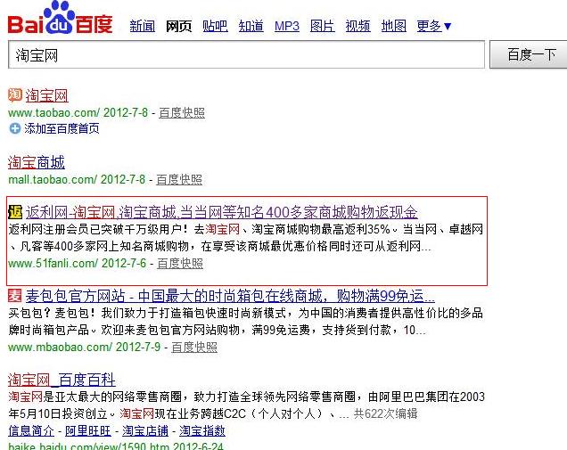 7月8号的时候,我又搜索了一次“淘宝网”,让我惊讶的是是,返还网这个淘宝客网站的排名不见了,甚至在前1000名都找不到了,但是返还网的竞争对手51返利网却排到了本来返还网的位置,我不禁要想:这到底是对手之间的恶意投诉竞争?还是百度内部的人工干预结果?