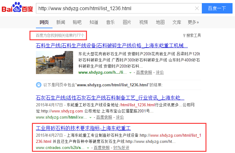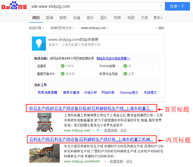 请看客先了解三件事儿: 第一:这是一篇SEO教程经验分享,篇幅较长,请耐心看完,你必定会受益无穷。 第二:这篇教程主要以企业站为案例,行业为本人所在的机械行业,僧多粥少,竞争残酷。但是方法是所有行业网站都适用的。 第三:教程案例网站——砂石生产线(此网站我正式接手一个月,由于诸多历史原因,网站内部并不是很完善) 正文开始: (1)分析其索引量:通过站长查询工具或者是site指令,分析对手网站被百度索引的页面数量、索引页面所在栏目等(通过此分析可以确定该网站哪些栏目和页面获得的权重较高),如果域名年龄长,站内也有稳定更新,但索引量却很少,证明该站对搜索引擎不是太友好。 (2)分析其基础: ①网站地图的三种形式是否都有:sitemap.txt、sitemap.html、sitemap.xml(可以直接通过竞争对手网址/sitemap.html查看); ②404页面是否有做,404是否有直接跳转。 2、分析对手网站的每个页面的标题是否都符合SEO基准。 通过site对手网站查看收录页面出现的标题。一个基于优化思路出发的网站,首页和内页的标题必定是经过重重筛选之后确定的。我知道有些CMS可以使内页的标题展现形式为:内容名称 + 网站关键词 + 公司名称,这样可以降低建站工作难度,但是对于优化而言这样做就失去了参与更多长尾关键词排名的可能。