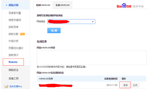 2、Robots 站长应该对robots都不陌生,但为什么还要提呢?有这样一种情况:站点需要更新robots文件,对站内部分内容禁止或放开抓取。但由于操作后没有检查是否生效,站长会默认为已经生效。同时还有一个生效周期的问题,那么站点需要在百度站长平台提供的robots检测工具中做一个抓取测试来验证是否生效。 如果看到robots内容和你更改后的内容不一致,有几种可能:第一种可能是网站没有全面布局,因为有的站点服务器可能在很多地方,你需要确认robots是否已全部推送;第二种可能是百度没有及时做更新,可以通过robots检测工具下方的更新按钮来告诉百度Robots有变化。