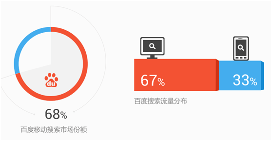 在移动搜索市场,百度移动搜索占据了市场68%的份额,依然是中国搜索引擎中的大佬,并且这个数据还在提升,流量也还在加大。