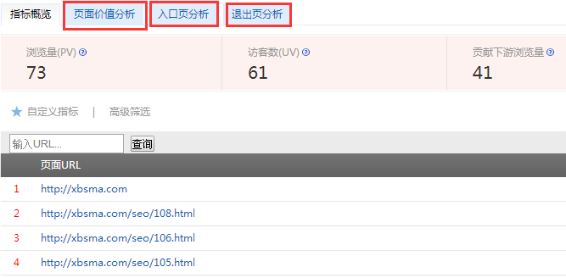 这三个数据应该说是整个网站数据分析中的压轴大戏了,因为我们要进行准确的站内布局以及页面调整都得靠这三个数据。 分析受访页面可以分析出我们网站哪些页面最受用户喜欢,能看出推广、外链以及内链效果做的怎么样,分析搜索词可以得出现在用户喜欢从哪些词进入我们的网站。 着陆页数据分析可以体现出网站外链、推广链接以及网站现在排名的效果,如果网站没有关键词排名,可以以此来推测我们的推广、外链的效果做的怎么样。 我们还可以通过搜索词分析哪些关键词给我们带来了流量,以及访问的页面是哪些,访问页的跳出率是多少,是不是应该推广这个页面帮助它提升排名。 5、分析页面点击图和页面上下游