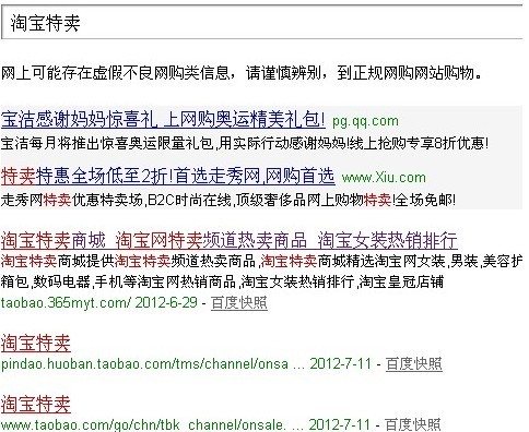 今日上午,我通过百度搜索引擎搜索淘宝特卖四个字的时候发现淘宝的众多子网站全部上了百度搜索引擎的前几名,结合近期的百度调整来看,难道说百度与淘宝有合作吗?也就在上一周我的一个返利网站从百度引擎第六名到了现在的千名之外,而我每天还是一如既往的关注这些关键词的信息,而结果却让我有些心灰意冷。
