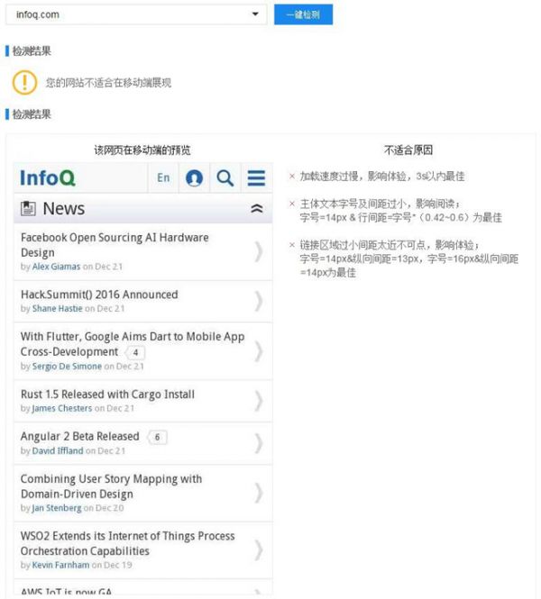 A5站长网()12月25日消息,今天百度搜索Mobile Friendly(移动友好度)标准V1.0与检测工具同时上线,据悉本次发布的是移动友好度标准V1.0版,后续会不断收集站长反馈并尽快发布移动友好度开发指南。 在2015年圣诞节之际,广大移动站点翘首以盼的《百度搜索Mobile Friendly(移动友好度)标准V1.0》(简称《百度Mobile Friendly》)正式亮相。为配合《百度Mobile Friendly》,让广大移动站长真正了解自己移动站点的问题,百度站长平台同时推出移动友好度检测工具!该工具可以对页面进行分析,报告相应网页是否采用了适合在移动设备上浏览的设计,并给出优化建议。以下为工具功能截图,快来试试你的网站吧。