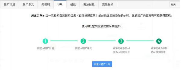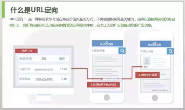 什么是URL定向呢? 官网解释:是一种新的获取有潜在商业价值流量的方式,不再需要购买海量的关键词,而可以直接购买相关的目标URL,当所购买的url出现在网民的自然结果中时,再其上方的广告位展现您的广告创意。