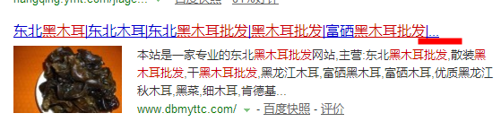 搜索结果太长我就不截图了,内容都差不多。通过上面两张图,我们基本上可以发现,用户最关心的有黑木耳批发,黑木耳价格,黑木耳种类(人造木耳),黑木耳产地(东北)等等,那么我们网站的标题该如何去撰写呢,最简单的就是把这些关键词组合起来,再加上我们的品牌词,如“黑木耳批发,黑木耳价格,黑木耳种类,黑木耳产地—XXX黑木耳批发厂家”。但是这个标题个人觉得真不咋的,只能勉强算是及格,虽然所有的关键词都被写进去了。 1、字数太长。字数太长的直接结果就是用户在百度进行搜索的时候你这个标题可能无法展现完全,就像下面这样,这是非常影响用户体验的。我们天天嚷嚷着要提升用户体验,这一点是必须得避免的。