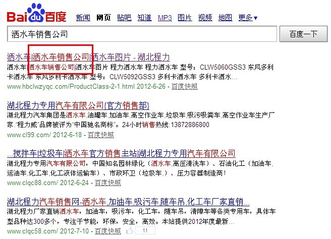 本公司是专业生产销售洒水车的,当然“洒水车”这个关键词的竞争性是很高的,大家都喜欢在主关键词的排名竞争上花费了大量的功夫,而却不注重长尾关键词的运用,由此我通过对百度推广助手做了一个研究,发现洒水车销售公司这个词有120的日均搜索量,当然还是有一定竞争力了,为了证实完全匹配的魅力,我于20天前将自己目录页的一个标题加上了个洒水车销售公司,没想到20天后看我的百度统计,还真的带来了不少流量,结果一搜索,我的网站在洒水车销售公司这个关键词中排名第一,有下图为证: