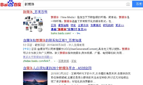 我们看到“新媒体”的搜索结果分别是百度百科、百度知道、A5站长网、虎嗅网、百度文库、新媒体管家、百度贴吧、百度图片、百度文库、360互动新媒体网。其中百度自家产品占据了6个。