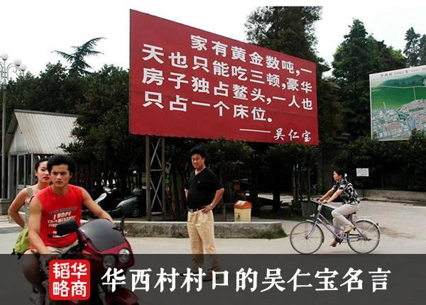 到华西,人们看的自然是令人惊叹的“天下第一村”:家家住别墅(最小450平,最大600平),户户有汽车,人均存款上百万,根本就是“中国首富村”。另外,村民吃饭不花钱,服装有自产名牌,教育全免费,老人“被包养”。吴仁宝还规定,老人过100岁,子孙统统奖1万,弄得村中敬老成风……这样富足的好日子,惹得有人不惜10万买户口,只为成为华西村民。所有人羡慕嫉妒恨:华西村农民才是天底下最幸福的人。 华西村的建筑建得“土洋结合”。98米高的金塔,耗费3.5公斤黄金镀成,是华西村的标志性建筑,顶上供着菩萨、寿星、天官、老子;仿颐和园长廊的“万米长廊”,号称世界之最,但修它的原因,却是吴仁宝想让村民出门下雨可以不打伞,长廊就连到了每一家。 而华西公园更像“世界之窗”,到处是“洋”景:美国“白宫”、英国“古堡”、巴黎“凯旋门”、德国“天文台”……以前农民出国不敢想,吴仁宝却要让村民天天能“出国”。