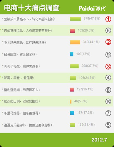 2012年7月9日-10日,由派代网发起的一轮,“关于电商行业痛点”的投票调查备受业内关注。该投票内容基本囊括了电商业内出现频率最高的几个问题,从营销、推广、利润、库存、环境乃至电商人身体状况,做出了全面的调查。短短1天时间,就有近千电商业内人士参与,目前投票结果见下图。