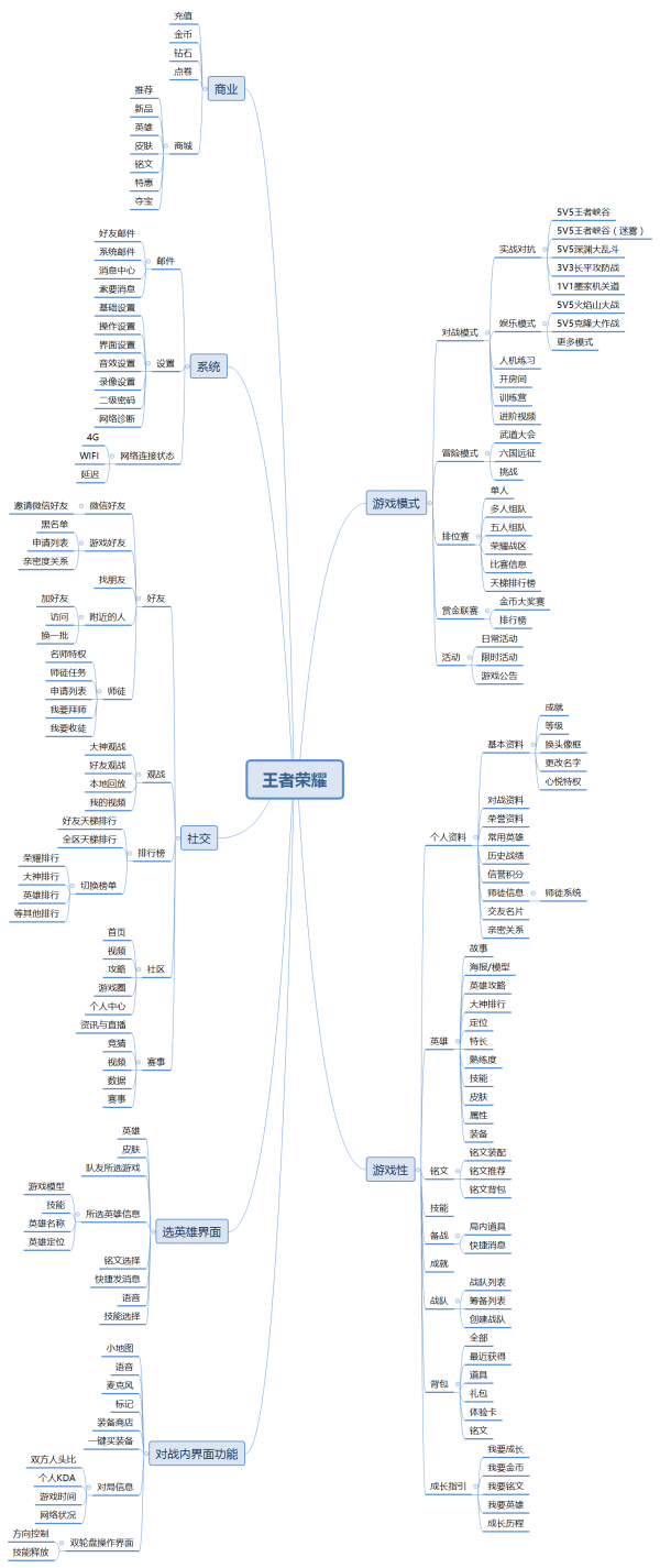 手机端精品游戏的需求:随着智能手机的发展和PC机势力的弱化,越来越多的用户拥有着智能手机并且使用时长在增加,然而手机端的游戏目前大多数都还是粗制滥造的,缺少足够多的精品手游; 碎片化娱乐的需求:智能手机的发展使得用户的碎片化时间更多了,用户使用智能手机的一个最大的特点就是时间碎片化,用户在碎片化的时间内无法进行深层次和连贯的活动,所以希望有一种利用手机“杀死”碎片化时间的方式,而且这个方式最好还是娱乐化、浅层次的,游戏就是一种可以说是最好的方式,因为游戏相比于新闻资讯、视频和聊天而言,是一种更加沉浸式的体验,所以用户有在碎片化的时间内在手机端玩游戏的基本需求。 社交的需求:即便是在端游的时代,各个网络游戏甚至是单机游戏都在想方设法的在游戏内加入社交和真人对抗的元素,因为只有人与人之间的互动才是最具有用户粘性的,但是PC机的时代,玩游戏要么是在家,要么是在网吧,很难经常聚集起足够多的认识的人一起玩同一款游戏,而且游戏里的陌生人是很难互相开始社交和互动的。和传统PC机时代不同,用户在用手机玩游戏时的场所和时间更加的多样化,玩游戏不再是一个私人、固定场所和只属于同好人群的上网活动了,用户在用手机上玩游戏的过程中不仅仅希望能够得到很好的游戏体验感,还因为手机的普及和手机玩游戏出现的场所和时间段的多样性而希望能够与人交流,获得反馈,他们渴望立即向他人炫耀、学习或者协作。 公平的需求:大部分的用户不仅仅希望游戏设计好,还希望游戏的体制是公平的,能够保证个体在游戏这个小社会内的生命权和发展权。 类《英雄联盟》游戏的需求:《英雄联盟》等MOBA类竞技游戏在电脑端已经统治了全世界,这充分说明了用户对于此类电子竞技游戏的需求,MOBA类游戏竞技元素多,可玩性高,玩家投入度、用户粘性及忠诚度均较高,团队协作带来的高对抗性、成就感以及归属感能够增加用户粘性,便于后续及周边的持续营销,同时游戏的责任边界模糊,最终使玩家在玩此类游戏时获取的成就感数倍于其他游戏,而遭遇的挫败感又可以忽略不计。对比端游而言,手游能够平衡竞技与娱乐,耗时相对较少,玩家更易上手和利用碎片时间。而且在手机端还没有出现一个在游戏品质和影响力方面类似《英雄联盟》的游戏,用户很可能会有在手机端也想玩《英雄联盟》等游戏的需求。 总结: 虽然《英雄联盟》是《Dota》的简化版,但他本质上还是一个需要长时间,重度去玩的游戏,所以他的目标人群就只能重点考虑那些理解力强、手速和反应迅速的重度男性游戏玩家,而《王者荣耀》由于定位于手机端,手机硬件和屏幕的限制很难让游戏的设定完全还原《英雄联盟》的游戏体验,所以它必然需要简化,既然需要简化,那么它的用户人群就一定会扩大,既然用户人群会扩大,并且用户人群都是腾讯的,那么玩家的男女比例就会接近1比1,玩家与玩家之间才能非常容易的出现社交因素,既然要出现社交的因素,那么游戏的上手难度就必然要进一步降低,直到能够让小白和女性用户入手,从而达到社交化的用户基数要求。所以可能《王者荣耀》的团队一开始并不想做一款这么没有操作难度的游戏,但是根据当时的手游发展状况,他们做出了一个相对较为合理的选择,并且受用至今。 五、产品分析 5.1产品功能结构图