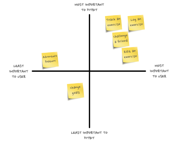 △ 白板上痛点的亲和图,每一个颜色代表一个用户 然后我给每个痛点按照它们对用户的重要程度和对Fitbit的重要程度进行了优先级排序。对用户重要性的假设是基于与现有和潜在用户的交谈上的。对Fitbit重要性的假设是基于我对它们的网站分析和市场材料上的。跟踪,记录和编辑运动记录是使Fitbit作为一个社交运动app脱颖而出的重要功能。