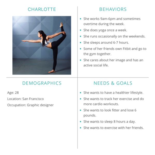 人物角色 在一开始,我基于线上调查和我了解的Fitbit用户创造了一个暂定的潜在Fitbit人物角色。这个基于假设创造出来的人物角色不是完全是研究型的,它是我项目期间引导我判断设计决策和优先级的重要因素。