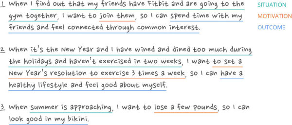 Job Stories 我曾经用目标问题框架来探索不同用户使用Fitbit的背景,并且以此来理解他们的动机和期望。 我基于我和Fitbit用户的交谈创造了以下的job stories: