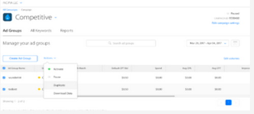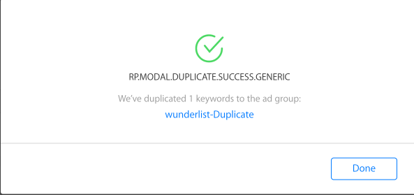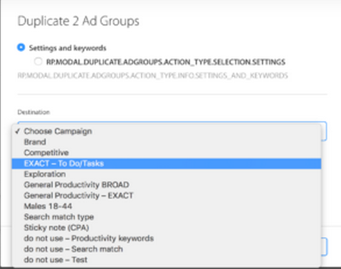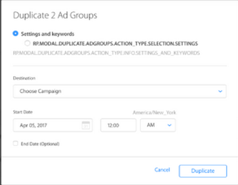 小提示: 对于苹果asm投放师而言,如果尝试将广告组复制到同一个广告系列中,则广告组名称的未尾会出现”-Duplicate”。如果投放师尝试将关键字复制到同一个广告组中,就会遇到命名上的错误提提示。“CN.ERROR.ADGROUP_SELECTOR.INVALID_SELECTION”。 相关图例说明: