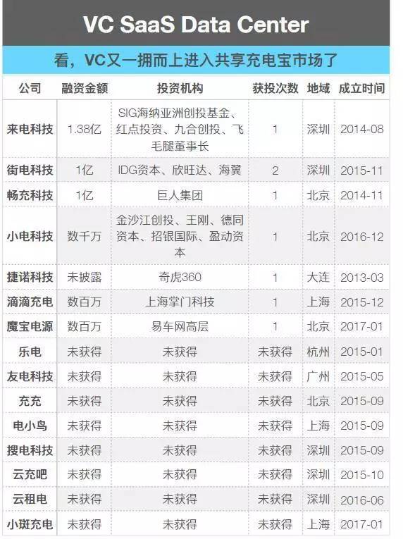 事情是这样的,共享单车之后又一个谜の共享经济火了——共享充电宝。 还是《金融界》的报道标题总结得好:《10天融资近3亿,IDG、腾讯、朱啸虎、王刚等20家机构入局,共享充电宝火了》,到底火不火我说了不算,具体看VC-SAAS这张表吧: