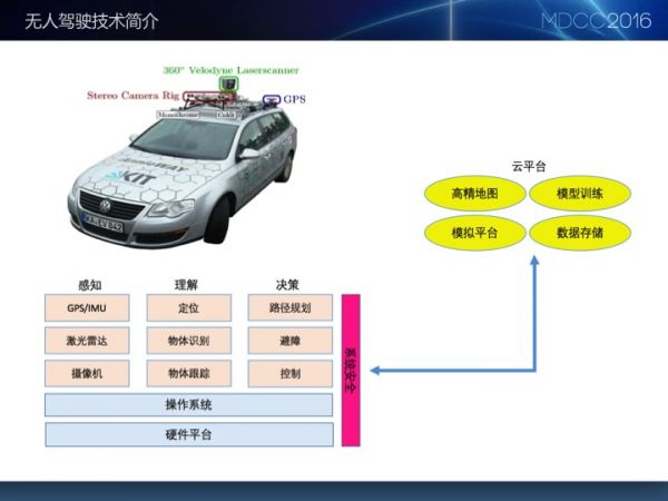 我对无人驾驶的看法,包括我们以前的经验和整个架构的搭建,概括起来分成三大部分。 第一部分是算法,算法包括了感知和理解。理解包括了定位和决策。有了这算法之后,车就能上路了。如果没有算法、硬件没做好的话,那就像一个只有灵魂没有肉体的孤魂野鬼,所以我们要为无人车打造一个很好的“肉体”,它就是操作系统、硬件平台。 为了支撑起无人车,我们需要一个云平台。云平台即使是在无人车的开发阶段也发挥了很大作用。投资朋友在投资无人车的时候,你要专注的是感知和理解部分,其实后面有很大一部分安全决策、硬件系统以及云平台,还有很多没有被涉及到。