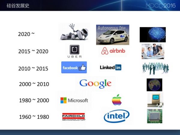 大家好!今天我这个演讲主题是“我们的时代”,这其实也是我们内部的一个技术分享。 我刚出来创业的时候,很多VC问过我,干嘛不做无人驾驶?我说我三五年内搞不定这个事。今天我就讲讲为什么我三五年内搞不定无人驾驶这个事,而具体它又涉及到什么部分。 首先我们看看为什么今天主题叫我们的时代。我看现在,最好是回看硅谷的发展历史。因为我在硅谷待了一段时间,比较了解他们所谓技术的发展历史。从60到80年代的硅谷,AMD,英特尔、IBM这三家公司做了硅片,随后便诞生了计算机概念了。但是当时计算机价格很昂贵,只有一些科研院校和大型公司,如波音,才负担得起。