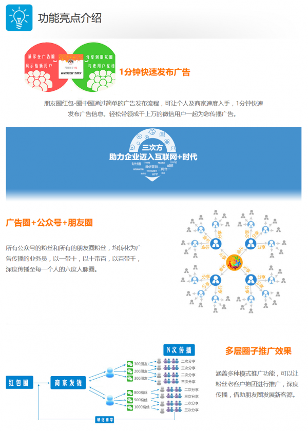 对,那就是将广告与红包相结合。在平台发布一个红包广告,用户点击进来看广告并抢的红包,是不是大大调动粉丝积极性?提高广告的传播率? 首先咱们来分析下广告与红包相结合有哪些优势: 1.吸引力。通过抢钱来吸引用户长期关注你发的广告动态,从而增加广告的曝光度,减少粉丝的屏蔽和流失。 2.趣味性。将生硬的暴力硬广广告变成圈子里抢钱互动的小活动,撒钱的大小和份数都可以控制,从而使得粉丝抢钱更有乐趣,还记得为了1分钱抢的头破血流的场景吗。 3.传播性。广告红包页面是可再次进行分享的,用户只需要点击右上角“分享到朋友圈”广告即被实现二次传播。 4.广泛性。你的广告不仅会曝光在平台,同时微信朋友圈、微信群等等都会找你你广告的踪影,因为我们有裂变的法宝,独特上供模式,每个抢钱者都可以发展下级,演绎圈子裂变理论,覆盖更多人群。 5.底成本。对于广告主而言去去百元的投入,就可以轻松覆盖到当地精准的几千曝光率,这是任何媒介都达不到的效果。 我们拿真实案例进行对比下。 比如某商店要做宣传,印制1000张的宣传单为例,印刷成本加上人工发放的成本最低也要300元,那么1000张宣传单发放出去后有多少人会认真的看到呢?我们做过调查统计出来的数据是50人。也就相当于花了300元让50人看到了商户的广告。那么如果拿300元发成红包广告呢?就拿大红包为例,300元分成600个红包,至少会保证有600个人看到广告,商户的钱才会被领完,同时广告以后会一直存在平台上。同样是300的成本一个是50人曝光率一个是至少600人的曝光率,不成比例啊。