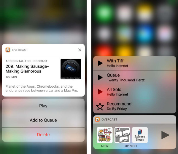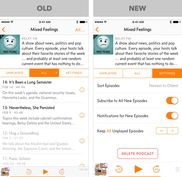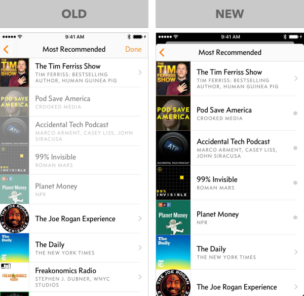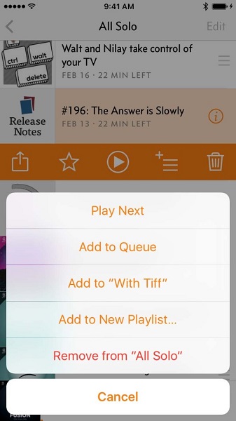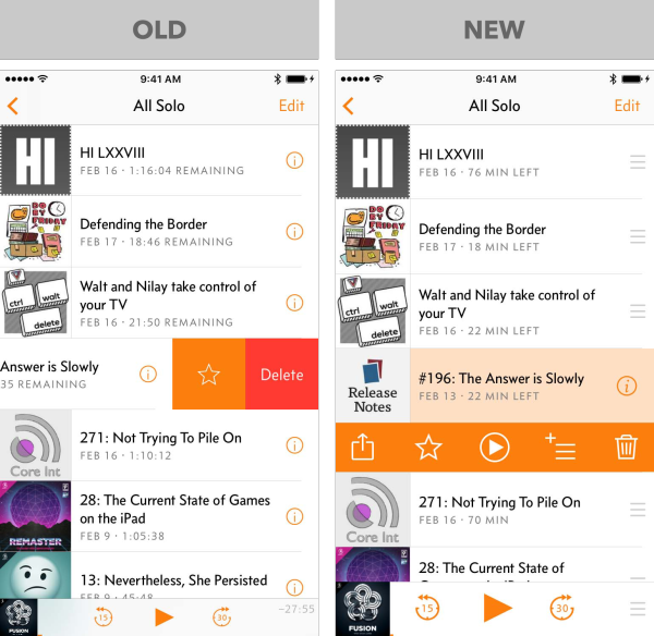 以前的版本中,点击列表中的剧集,会立刻开始播放。在你想要听的时候,这是很好的,但是意外触碰到会引起问题:我发现当我试图重新排列、删除、或者查看详情时,太容易开始播放。 很多用户从来不会滑动单元格(或点击“Edit”按钮),因此他们永远都不会找到删除按钮。自从Overcast 1.0发布,我收到了几百封电子邮件,问我如何不在播放的状态下删除剧集。