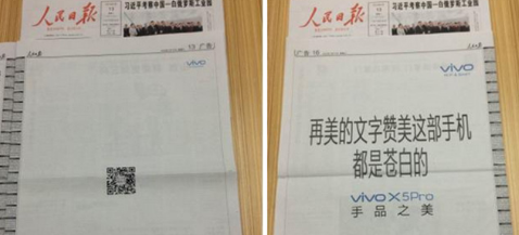 新媒体与纸媒资源 但如果你是主营保健品以及中老年产品和服务的品牌,就还是应当以传统媒体作为主要推广渠道。这类渠道包括电视广告,自然也包含纸媒。 而且当你主营的是具有地域性特色的产品时,纸媒也是派的上用场的。此外再举个栗子,如果你的消费群体是年龄成熟并且文化层次较高的人群的时候,选择具有知名度的纸媒进行推广,肯定比选择各类新媒体平台效果要好。 新媒体和纸媒资源,既可以单独用于企业和品牌的推广,也可以线上线下结合来共同为品牌推广出力。只要能覆盖到更多的目标群体,那么这一系列动作就都是有意义的。 有资源也要有套路 在这里戈壁传媒还想说,充分将新媒体和纸媒资源利用起来后,在具体实施推广的时候,还是要花点心思,整点套路,才能获得更好的曝光率与关注度。 在各类新媒体平台进行推广的时候,可以将广告写成段子,做成漫画或者视频。在当今的新媒体传播环境中,只有更有意思的推广形式,才不会让火眼金睛的消费者们感到排斥。 此外,中规中矩的纸媒,也是可以玩出新花样的。 例如vivo手机就曾经在2015年,在人民日报上用了整整四个空白版面来为产品打广告。消费者先是看的一头雾水,直到看到最后一版的大体文字:再美的文字赞美这部手机都是苍白。才恍然大悟,这是在用传统的报纸打了一次创意十足的广告,传播效果与话题度满分。