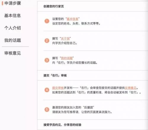 申请材料并不复杂。基本信息部分,需要提供真实姓名、任职机构、头衔/职位、工作年限、手机号、邮箱、常驻城市以及在常驻城市经常活动的区域,也可以提交身份证明人和名片,但不是必选项。并不要求提供身份证信息。 个人介绍部分,必须要填的是,从业期间做过的项目或工作内容,在职业或兴趣方面的成功经历分享等。 话题部分,申请者要填写的是,话题相关的行业现状或趋势,学员容易遭遇的困扰,行业中容易陷入的误区,能为学员提供的帮助,以及在该领域中的资历或成就等。 申请页面显示,提交申请之后,在行会在 3 个工作日内做出反馈。 这样的遴选机制并不能保证行家真正“在行”。一些用户向刺猬公社反映,“行家有些还行,有些就很水”。 (责任编辑:admin) |
