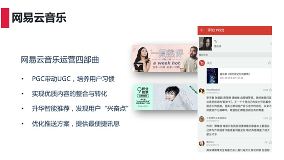网易云音乐选择了一些网友评论,把它们展示在杭州的地铁上,这件事引起了朋友圈的转发,也许很多人会觉得这是一个营销策划活动,但其实是网易云音乐的内容运营多年的积累和沉淀。在这个列车上真正感动到大家的是那些温暖的文字,并且引起了共同情感,这才是内容运营的核心所在。 产品运营和内容运营有一个很强的关系,我们都渴望用户产生一些优质的内容,但是当用户产生优质的内容的时候,首先是要能够真正打动用户内心的情感,若用户愿意跟你互动,那产生的内容就能够让产品另外一端每位用户的心和情感紧紧的联系在一起。 所以,很多人会觉得网易的产品做的很好,为什么?就是因为把用户的心紧紧的联系到了一起。因为往往越真诚越打动人心的东西,才能让更多人有共鸣。 内容运营到底要做什么?应该怎样去做?网易把内容进行了层级划分,分为白、灰、黑三层。 白:如何让优质内容自涌现? 优质内容是什么?怎样挖掘? 最真诚,最真情流露的东西往往最能打动别人。 过节的时候父母给你发了一条短信:“天冷了,添衣,别感冒了,注意身体。最近工作很忙,要记得休息。” 就是这样一些纯朴的内容会出打动我们的内心,优质的内容是健康的、真诚的、理性的、友善的。这里要强调一下理性,大家会发现网易云音乐的评论中可能有一些内容明明是在表达一个对的歌手的想法,但是一些粉丝会觉得你不能说我偶像不好,然后就产生了一些开撕的内容,如果这样的话,其他用户点进去还会有温暖的感觉产生吗?所以并不是说产生热点的东西就一定是好的,产生热点的东西必须要有理性存在,必须非常健康、真诚、理性、友善。