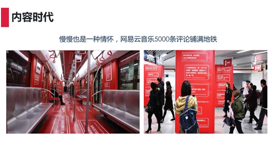 这个是一张来自于杭州一号线地铁的一张场景图。坐地铁是一个很漫长的过程,有时候会让人习惯性的脑袋放空。但是 3 月 20 号,当大家走进地铁的时候,很多人都会停下脚步认真的看地铁上的每一条内容。瞬间掀起了一阵“网易红”。