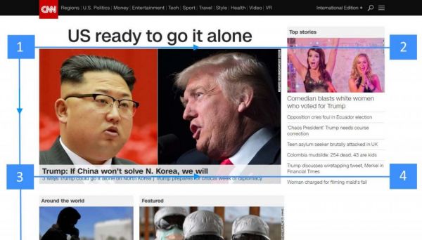 CNN 首页也使用了「F 型扫视」模式 网页应该怎样用「F 型扫视」? 借助「F 型扫视」模式,设计师在页面内容选题方面有更多的「话事权」。 1. 按重要性对内容排序 在设计规划页面元素时,一定要按重要性对各项内容进行排序。通过排序,你可以清楚地知道你最想让用户阅读的内容。这样一来,你只需要将这些内容放在页面的「热点」区域即可。 2. 设置预定期望 整个页面最开始的一两段是非常重要的。尽可能将重要内容放置在页面顶端,从而可以在短时间内让人们知道网站(或页面)是用来做什么的。 根据「F 型扫视」模式,我们通常会横向阅读页面顶端。因此,在顶端区域设计一个导航栏是个不错的选择。