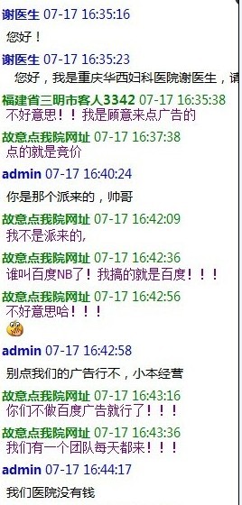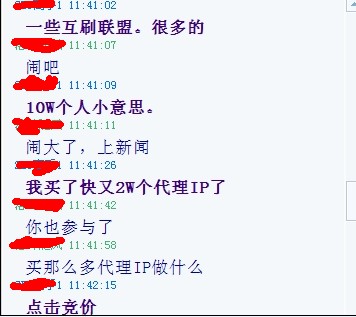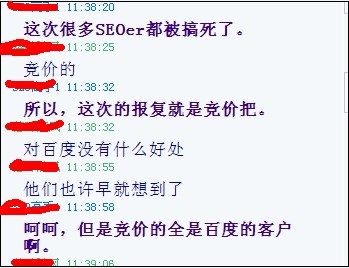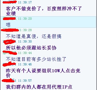 图片中的对话不是PS的,的确是真实的,百度官方声称“在我们的评估中,本次升级将会影响5%的搜索流量,此措施已经生效”,我们在各大论坛,QQ群,站长网都会看到这样的信息,5%的搜索量,已经让很多站长趴倒在地了,站起来需要很长时间。 随着时间的推长,恶意点击百度竞价的站长也越来越多,目前已经有人组成10w的站长参与此事,不惜成本和代价来引起百度的重视,下图是今天早上和一位站长的聊天记录。