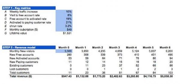 不仅如此,它还会告诉你每获取一位新用户,最多能花费多少钱。所以说,只要你着手去设定相关的衡量指标,那就能够在最短时间内准确判断出某项活动是否值得进行或者继续。 Gary Gaspar曾经针对SaaS企业制作了一张简单的表格,你可以把自家企业的数据带进去计算,得出相应的结论。Happy Bootstrapper也曾经针对SaaS企业制定了一张每月经常性收益的预估表格。当然了,如果你觉得这两张表格罗列出来的数据和指标不够全面,那么还可以试试Christoph Janz针对早期SaaS初创企业制作的关键业绩指标表格。