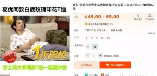 如果我们借助丧文化,制作产品,买个葛优躺同款印花T恤,也能为网店带来不少“网红流量”、成功借势。或者制作葛优躺同款动漫营销,推出新睡衣……