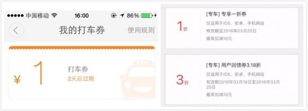 活动盒子新建活动页面 一套活动系统可以被用到多个场景之中,支撑起多种活动,就可以被拿来复用,而且原有的活动模式已经验证成功,通过系统复用,不仅可以保证活动快速上线,也能够培养用户习惯。 4.关注竞品,看看最近有什么大动作 在做用户习惯培养时,还需要时刻观察竞品,为差异化运营做准备。 在滴滴和Uber厮杀得火热的时候,易到用车横空出世,为了分得专车市场的一杯羹,易到用车也对用户进行补贴,以下是同一时期滴滴和易到用车的打车券。