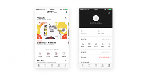 △ Enjoy界面 Complexion Reduction风格也已经在国内流行开,ENJOY是一款从中高端人群切入,为用户提供高端餐饮体验的生活化电商平台。ENJOY的界面主要以黑白为主,给人以高级感觉,凸显出所售卖商品的品质。 2. 变大、加黑、变粗的标题