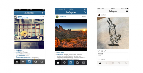 △ Instagram界面 Instagram 是一家图片社交媒体,在UI改版时有明确的设计目标,是为了突出Instagram这个产品最最核心的东西——照片。新的界面利用纯白底色减少干扰,让用户更关注内容,除了遵循平台设计规范,大部分改变都是为了让内容更突出。
